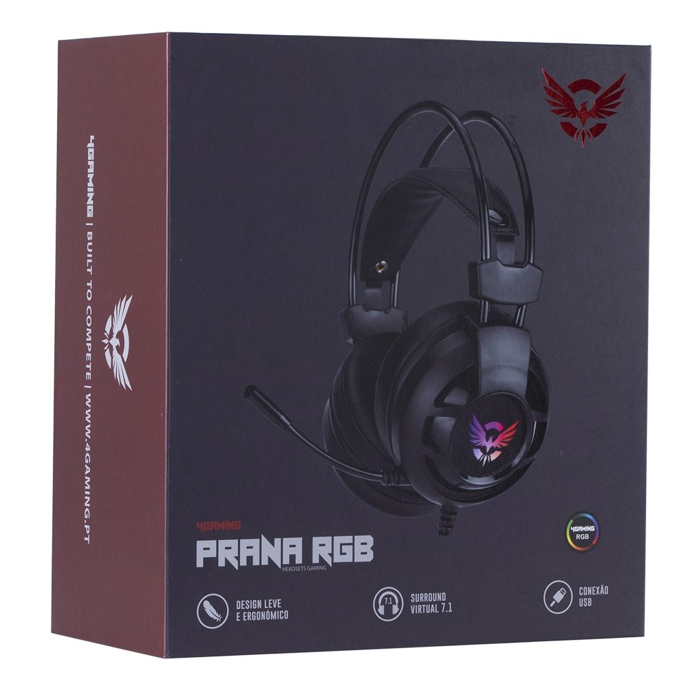 Os headsets PRANA RGB vêm acondicionados numa embalagem Premium, de estrutura rígida, resistente e agradável ao toque.