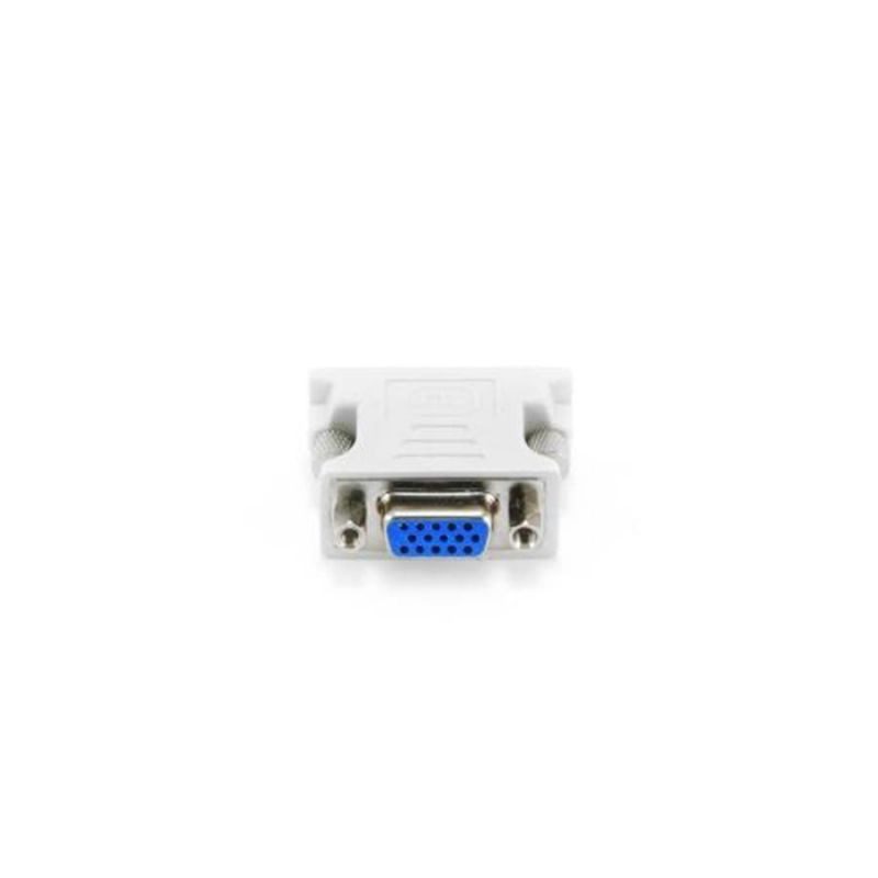Adaptador de conexão DVI macho para VGA fêmea. Indicado para ligar ecrãs CRT ou LCD que apenas disponham de entrada VGA a equipamento que possua saída de imagem DVI–I.