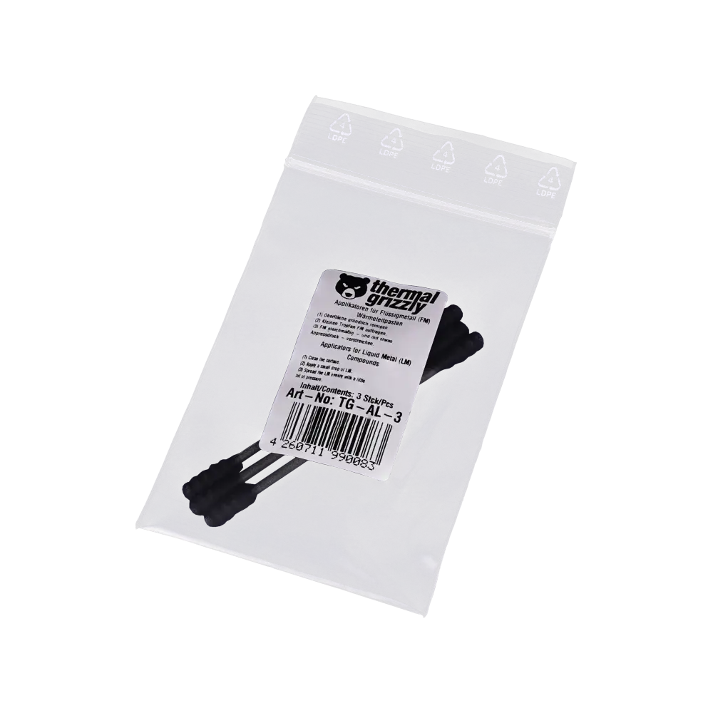 Com este pacote, você obtém três aplicadores pretos da Thermal Grizzly , que permitem a aplicação ou até a distribuição de uma pasta térmica de metal líquido. No entanto, a pasta térmica de metal líquido não deve ser usada com superfícies de contacto de alumínio e nunca entra em contato com componentes condutores de eletricidade.
