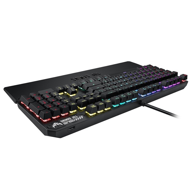 Teclado mecânico ASUS TUF Gaming K3 RGB com N-key rollover, combinação de teclas multimédia, USB 2.0 passthrough, tampa superior em liga de alumínio, oito teclas macro programáveis e iluminação Aura Sync.