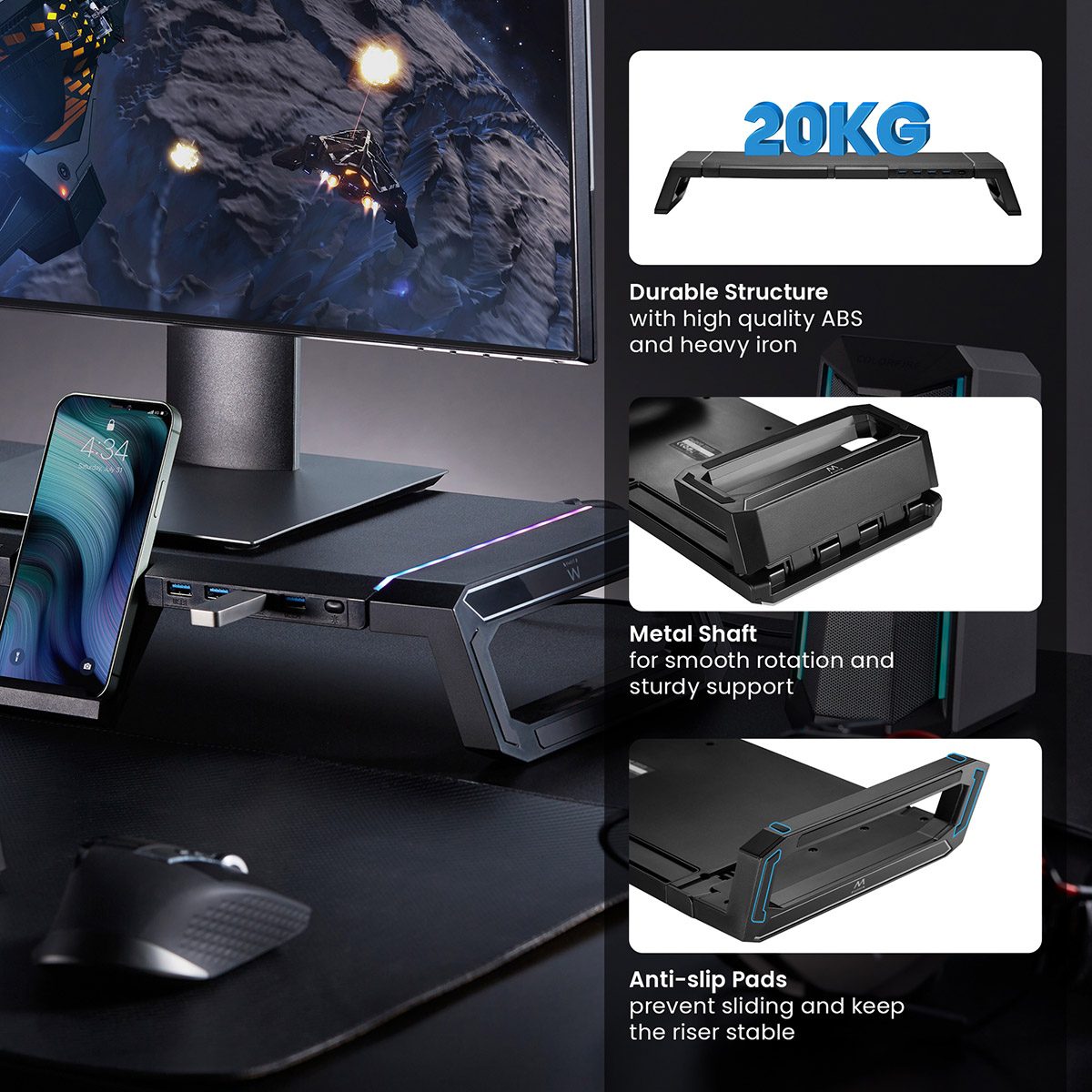 O suporte de computador para monitor de secretária tem 4 portas USB 3.0. Ligue o cabo USB (incluído) para ligar à porta USB do seu computador; terá então 4 portas USB 3.0 adicionais. As luzes decorativas RGB têm 10 efeitos de iluminação pulsantes. Proporcionam-lhe um ambiente diferente de acordo com a sua escolha.