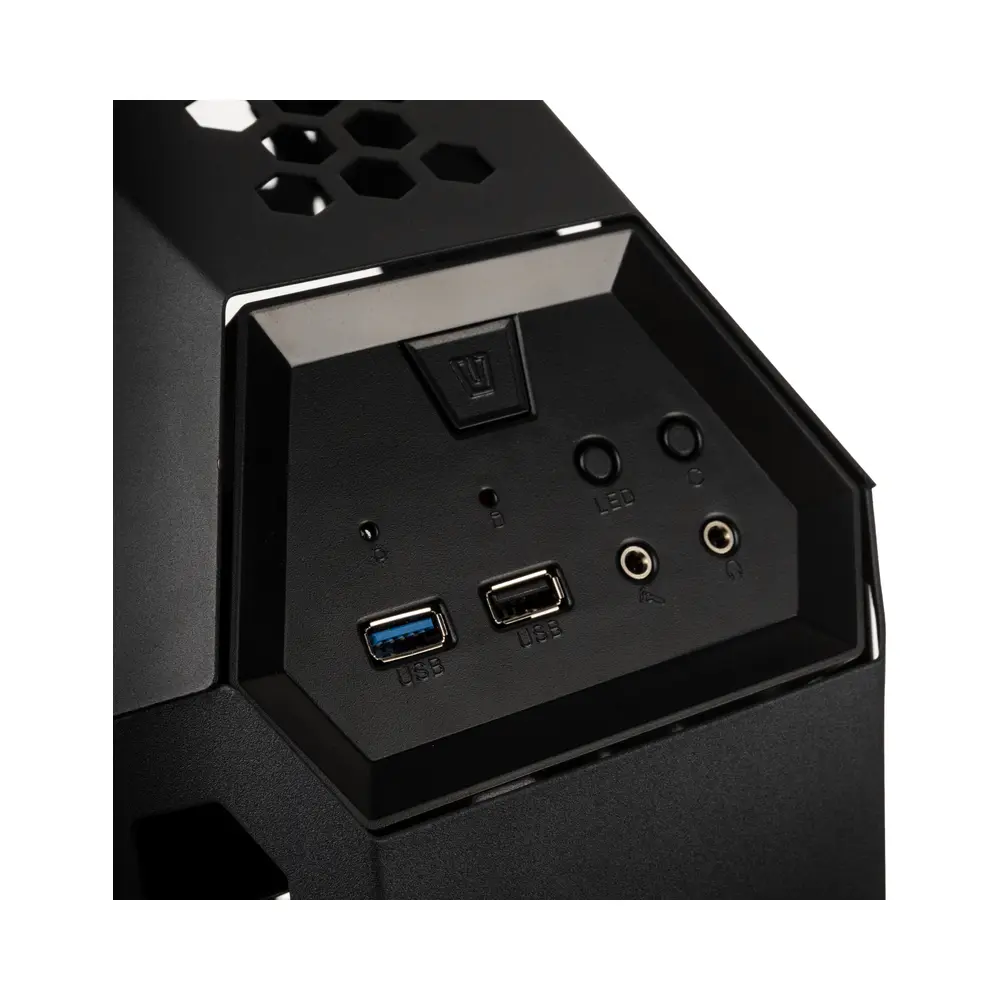 O painel de I/O é colocado na parte da frente do topo. Oferecendo muitas possibilidades de ligações para os seus periféricos, há uma porta USB 2.0, uma porta USB 3.1, e entrada de áudio HD tanto para microfones como para auscultadores. Além disso, existe um botão LED para um acesso rápido e fácil à sua iluminação.