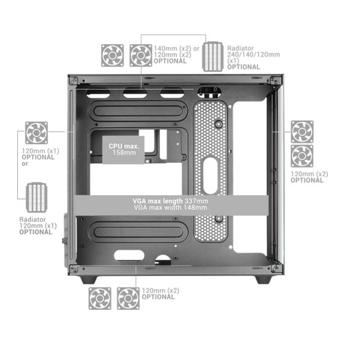 Quer levar a sua configuração ao extremo? Com o MC-NOVAM, pode fazê-lo sem preocupações. Com capacidade para até 7 ventoinhas, 5 discos rígidos, placas gráficas até 337 mm e radiadores de 240 mm, as possibilidades são infinitas para criar um sistema de elevado desempenho com placas Micro-ATX e mini-ITX.