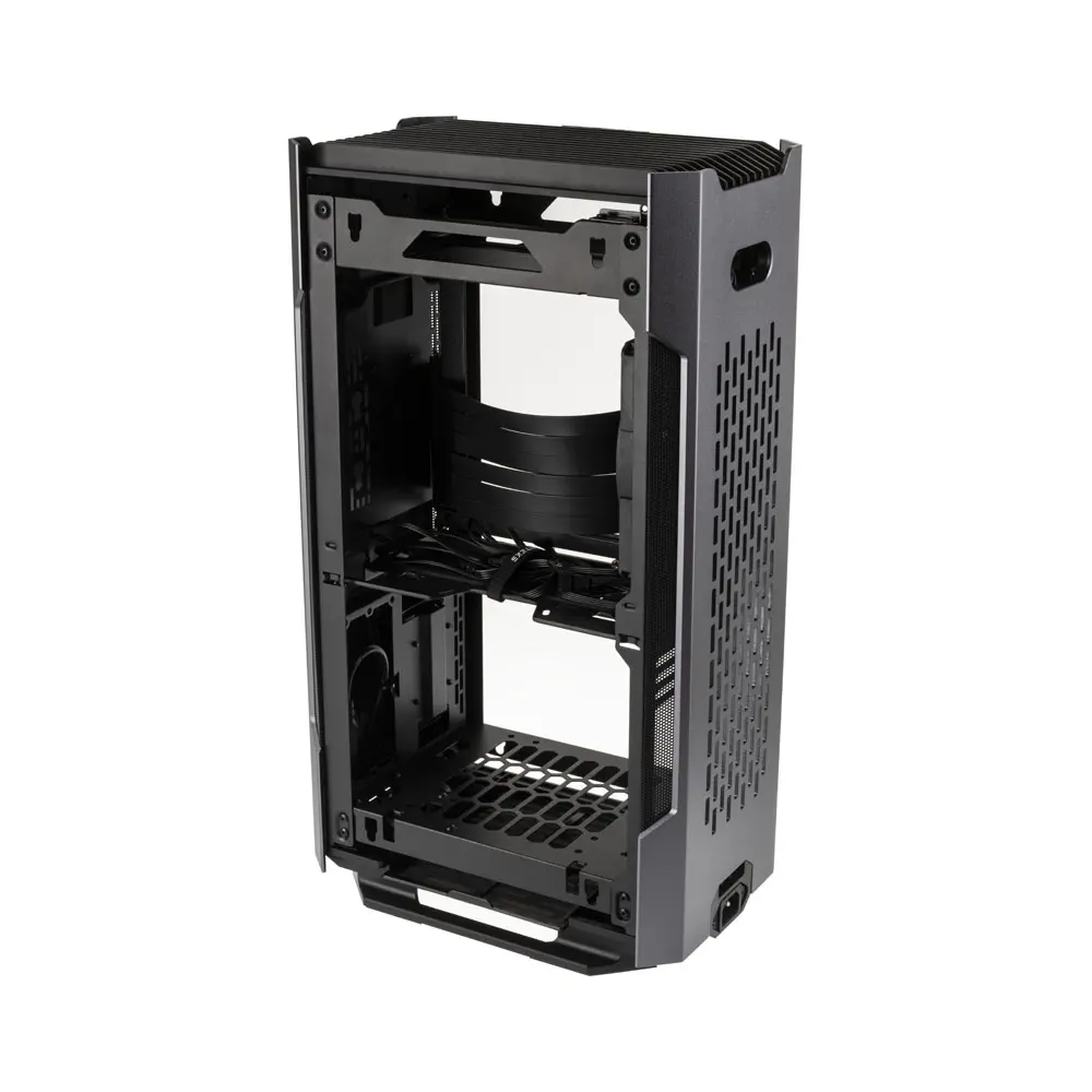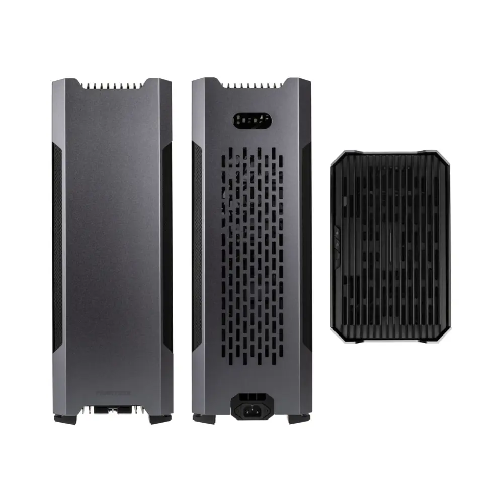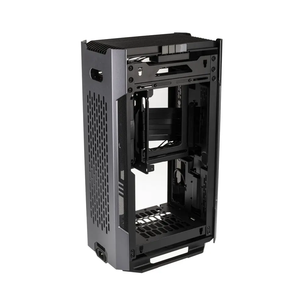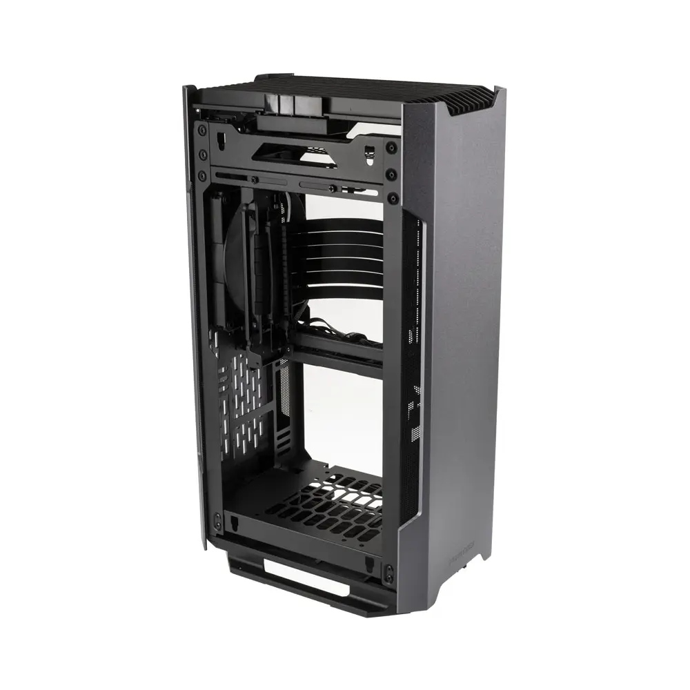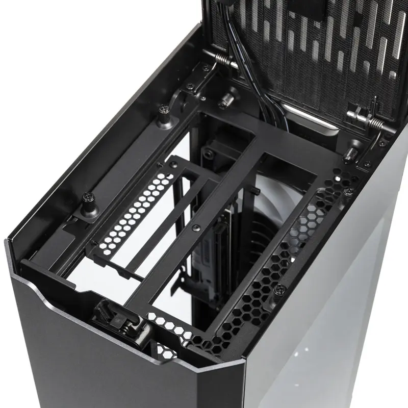A base ultra-pequena dá-lhe mais flexibilidade para colocar a Evolv Shift 2 numa secretária ou no móvel enquanto a grelha superior se abre com um simples toque para oferecer acesso direto às portas IO- traseiras da motherboard e da placa gráfica. Todos os cabos externos são escondidos por este painel superior, de modo a obter um aspeto extremamente limpo em todos os lados. Durante o processo de construção, todos os 4 painéis podem ser facilmente removidos para que os componentes possam ser acedidos de todos os lados.