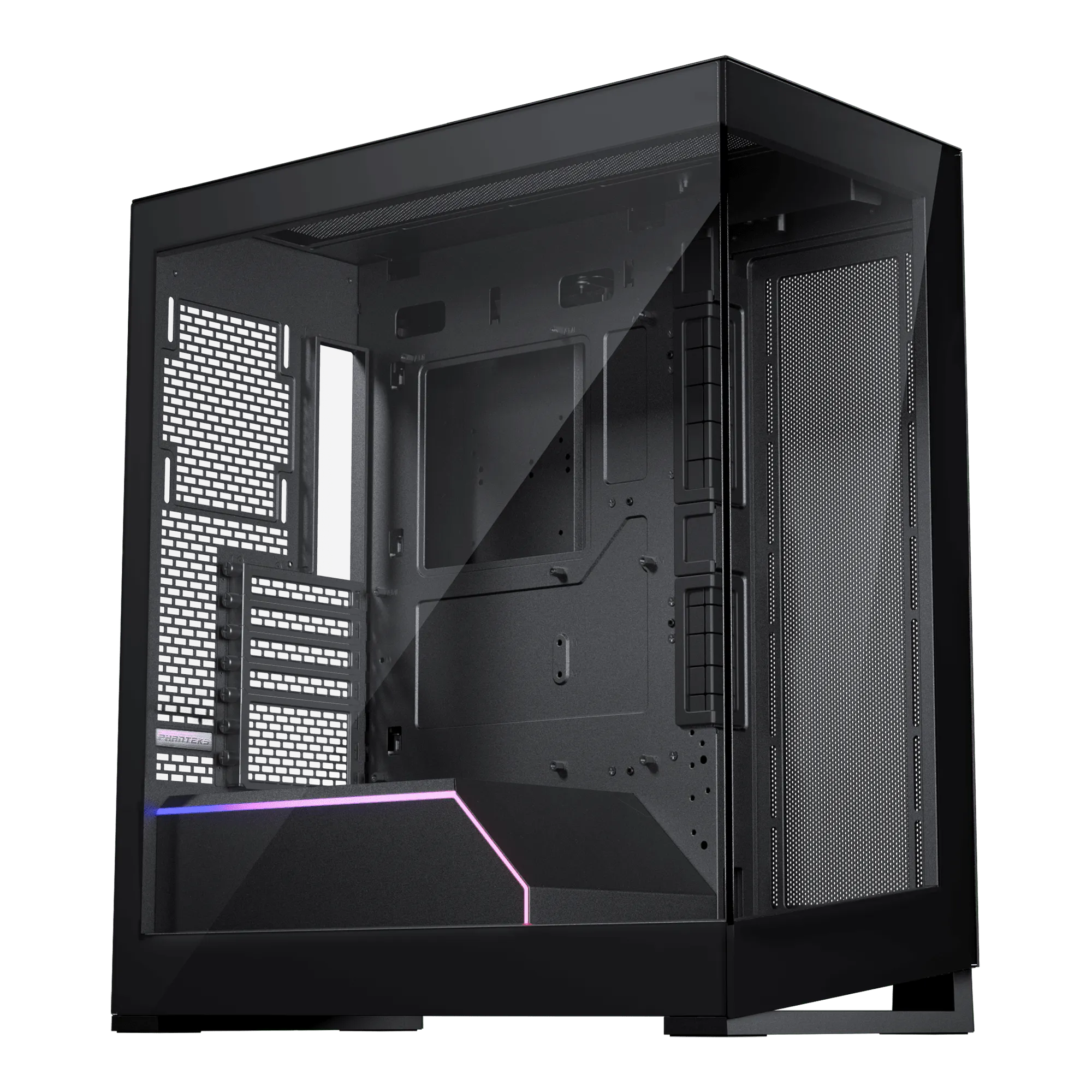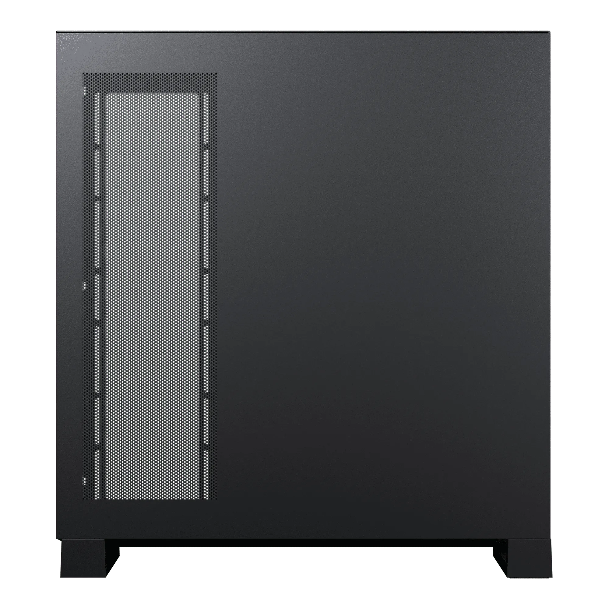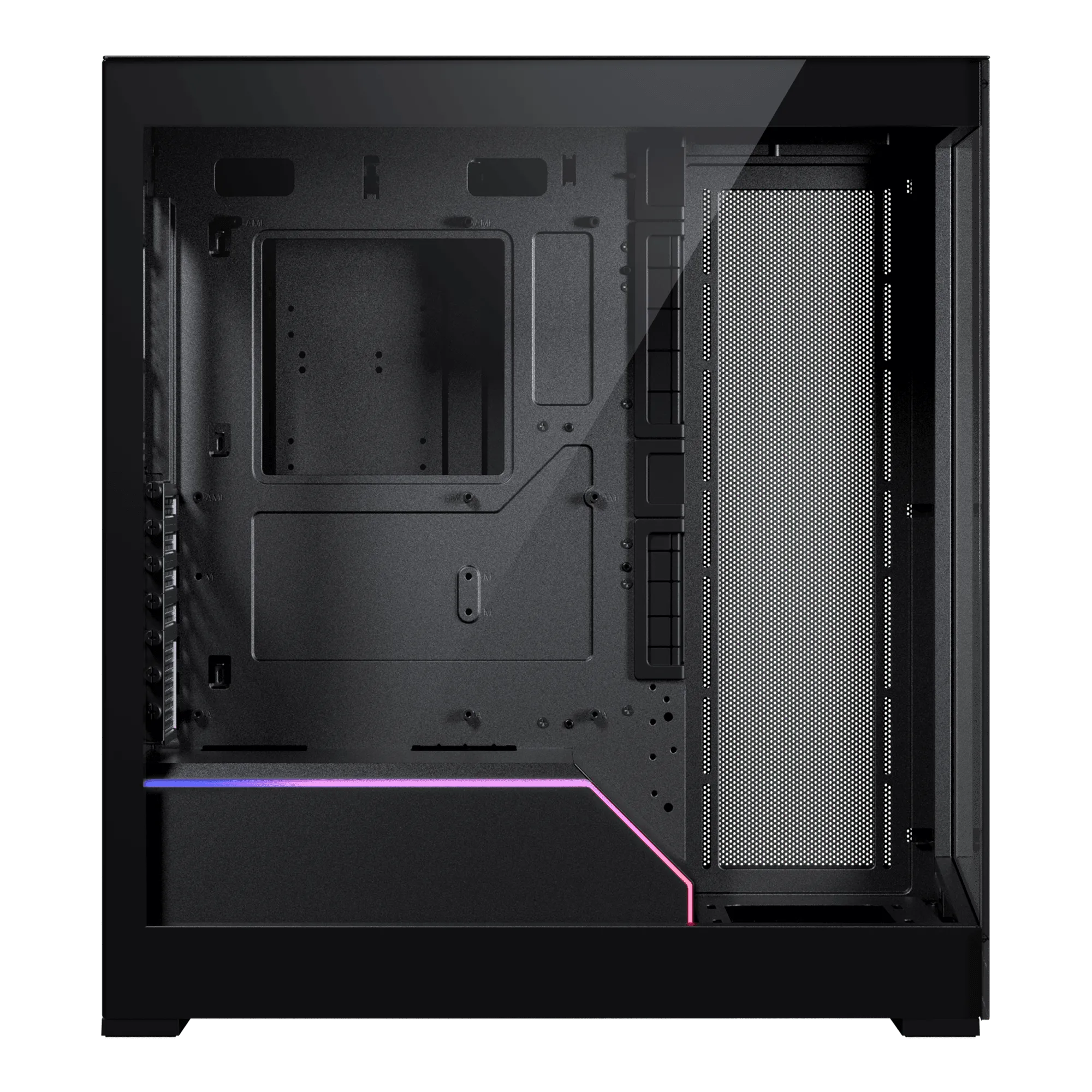 A caixa é inteiramente feita de aço moldado. O painel esquerdo e frontal são feitos de vidro temperado, proporcionando uma excelente visão dos componentes internos. O painel de E/S inclui um botão de alimentação, áudio HD e tomadas de microfone, bem como uma porta USB 3.1 Tipo C e duas portas USB 3.0 Tipo A para transferências de ficheiros mais rápidas. Além disso, existem dois botões para controlar a iluminação ARGB.