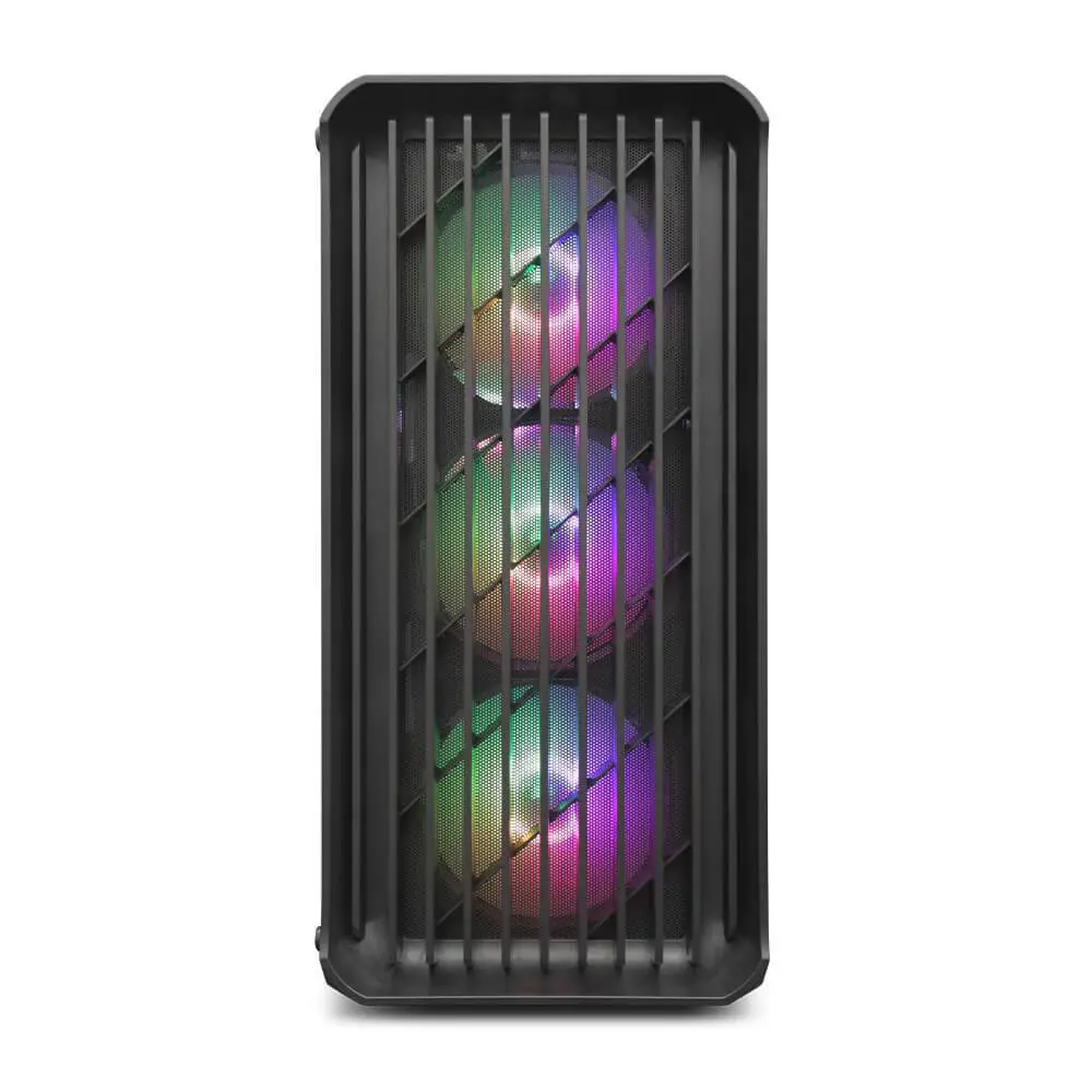 O painel frontal ripado melhora a ventilação, enquanto as três ventoinhas ARGB de 120 mm pré-instaladas garantem um excelente arrefecimento e um espetáculo de luz deslumbrante para o teu setup.