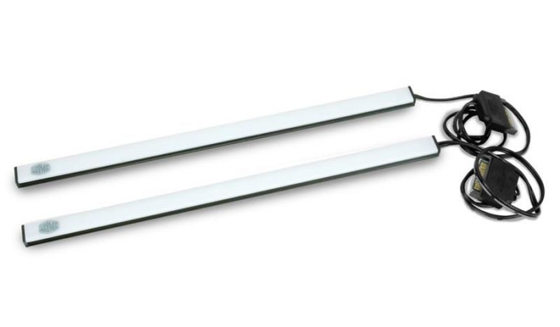 As tiras LED do Cooler Master são suficientemente brilhantes para ver claramente em casos com painéis laterais mais escuros como o nosso Painel de vidro temperado.