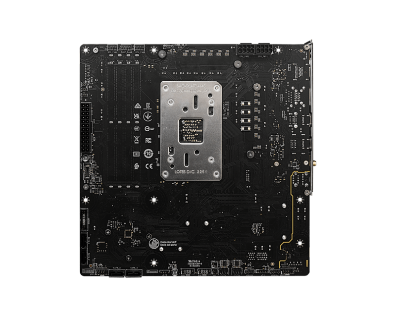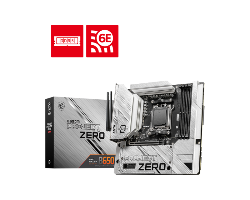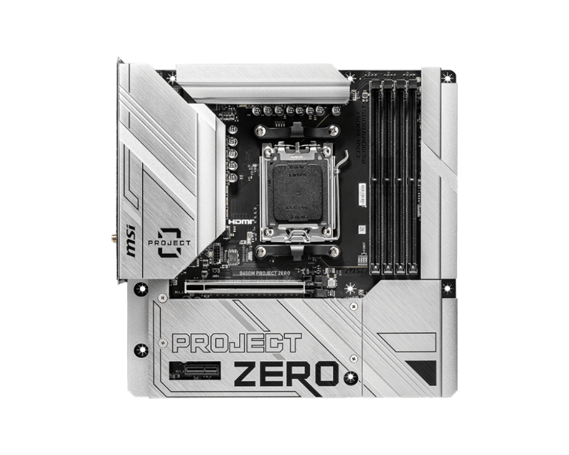 A B650M PROJECT ZERO move os conectores de energia, os conectores de ventoinha e outros pinos para a parte traseira da motherboard. Isto proporciona uma visão frontal mais limpa e arrumada, permitindo que o design estético da motherboard, do cooler líquido e da placa gráfica seja totalmente exibido.