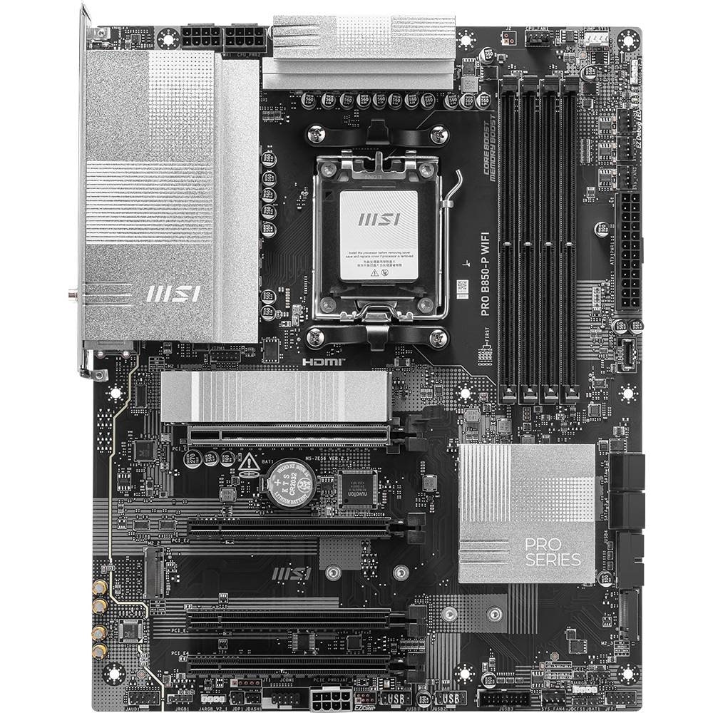 A PRO B850-P WIFI oferece um design simples com um esquema de cores prateado harmonioso que combina na perfeição com PCs brancos e pretos. Foi concebido com muitas funcionalidades exclusivas da MSI, um verdadeiro Wi-Fi 7 com EZ Antenna, LAN 5G, PCIe 5.0 M.2 com EZ M.2 Shield Frozr II, e Supplemental PCIe Power, pronto para os processadores AMD Ryzen™ série 9000.