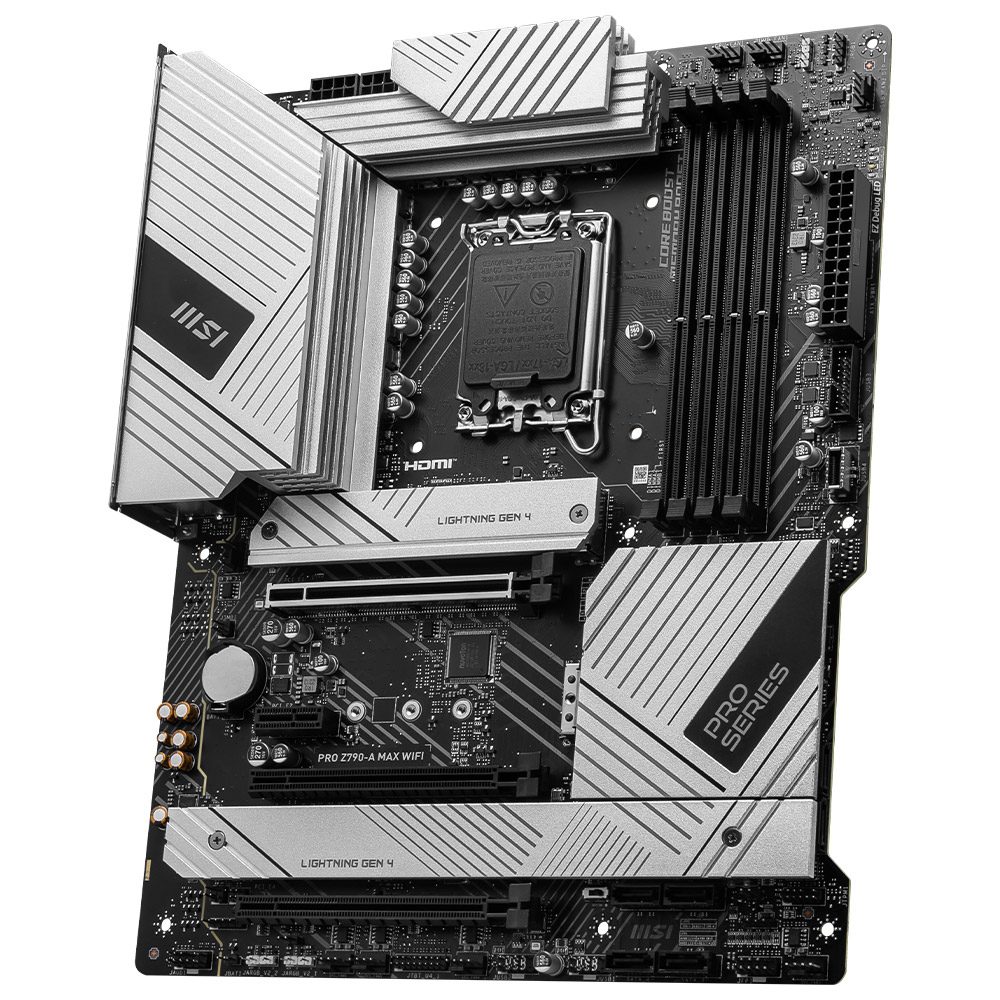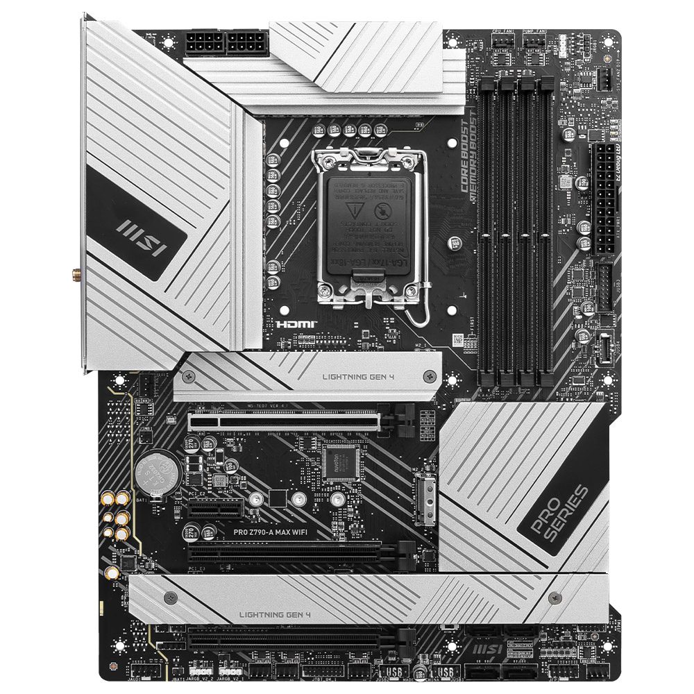 A PRO Z790-A MAX WIFI oferece um design simples com um harmonioso esquema de cores prateado que combina na perfeição com PCs brancos e pretos. Foi concebido com muitas funcionalidades exclusivas da MSI, uma conveniente solução Wi-Fi 7 e otimização DDR5 para processadores Intel® Core™ de 14ª e 13ª geração.