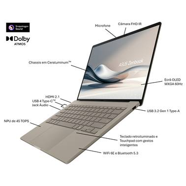 Faz coisas maiores com um design mais leve! Com menos de um quilograma, o Zenbook A14 nasceu para ir a todo o lado. O processador Snapdragon® Série X liberta todas as vantagens do Copilot+ e potencia o teu estilo de vida com uma bateria que dura vários dias. O novo design minimalista, com cores tom sobre tom e materiais inspirados na natureza, exala elegância. A tampa do portátil, a estrutura do teclado e a base são fabricadas em Ceraluminum™, o nosso fantástico material anti-desgaste, anti-riscos e anti-manchas.