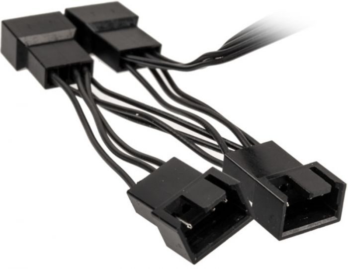 O cabo splitter 1-4 Ventoinha PWM Kolink é um splitter 1-para-4 que permite ao utilizador ligar até quatro ventoinhas PWM a uma única entrada de ventoinha PWM na motherboard. Como as ventoinhas são controladas através de PWM, as rotações de cada ventoinha vão alterar consoante a temperatura do processador ou de acordo com as definições da BIOS. Caso o sistema não necessite de airflow elevado, as rotações e o barulho vão diminuir.