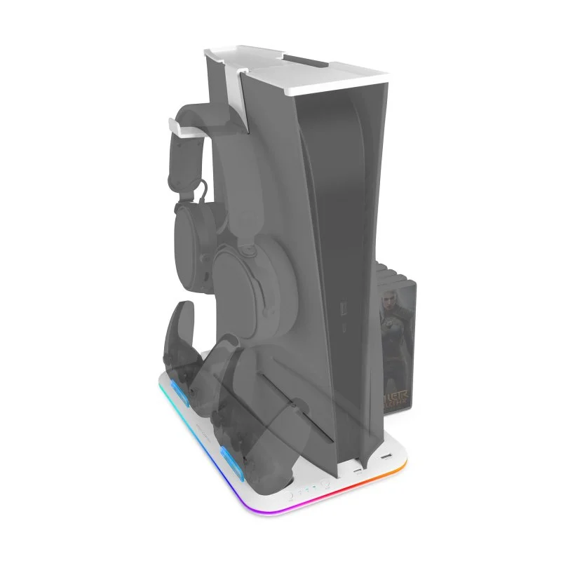 O design versátil do suporte PS5 inclui um suporte de fones de ouvido integrado, proporcionando um local conveniente e acessível para guardar os seus fones de ouvido quando não os estiver a usar. Mantenha todos os seus acessórios arrumados e facilmente acessíveis em todos os momentos.