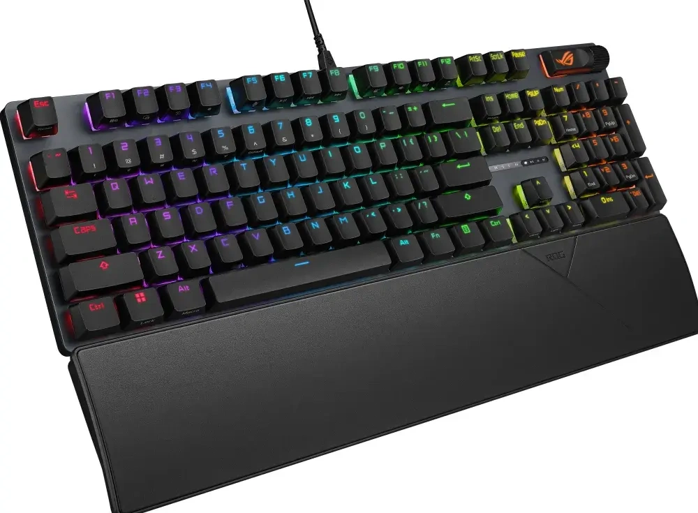 O teclado ASUS ROG Strix Scope II NX Gaming Keyboard com interruptores mecânicos ROG NX Snow e NX Storm pré-lubrificados, espuma antirruído, teclas PBT doubleshot ou teclas ABS com revestimento UV, teclas de atalho para streaming, controlos multifunções, três ângulos de inclinação e apoio para o pulso.