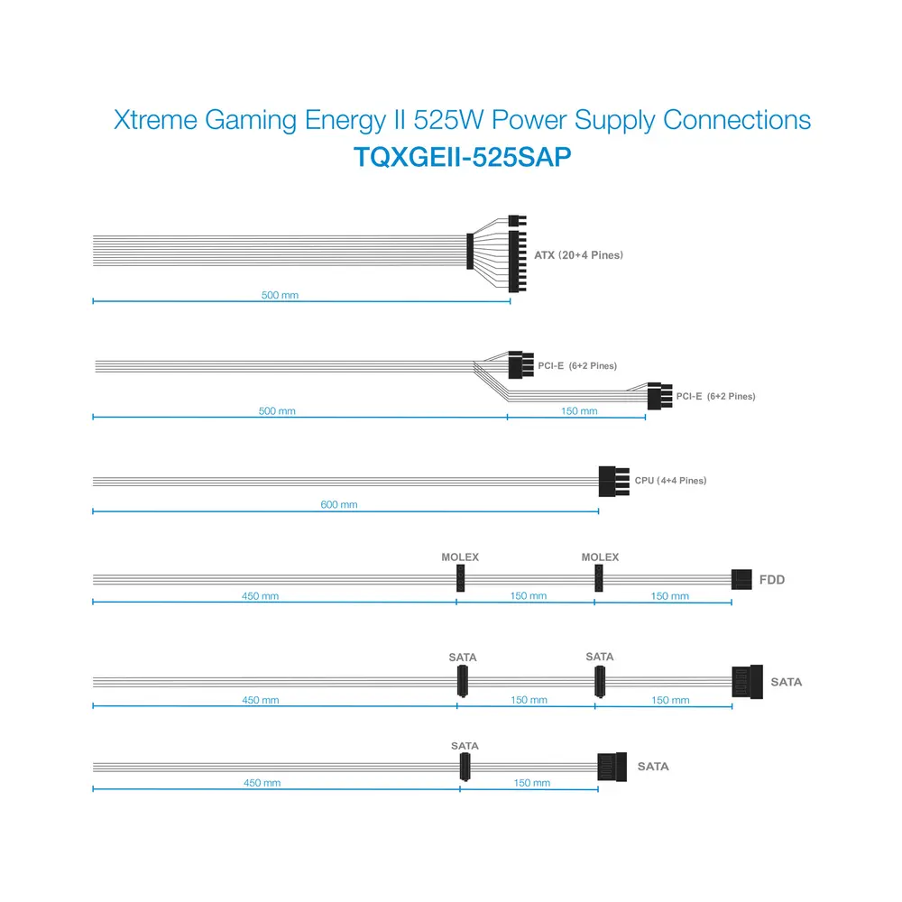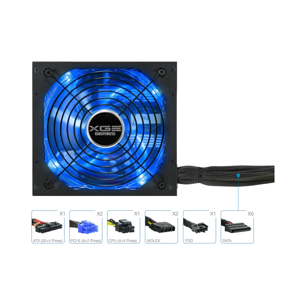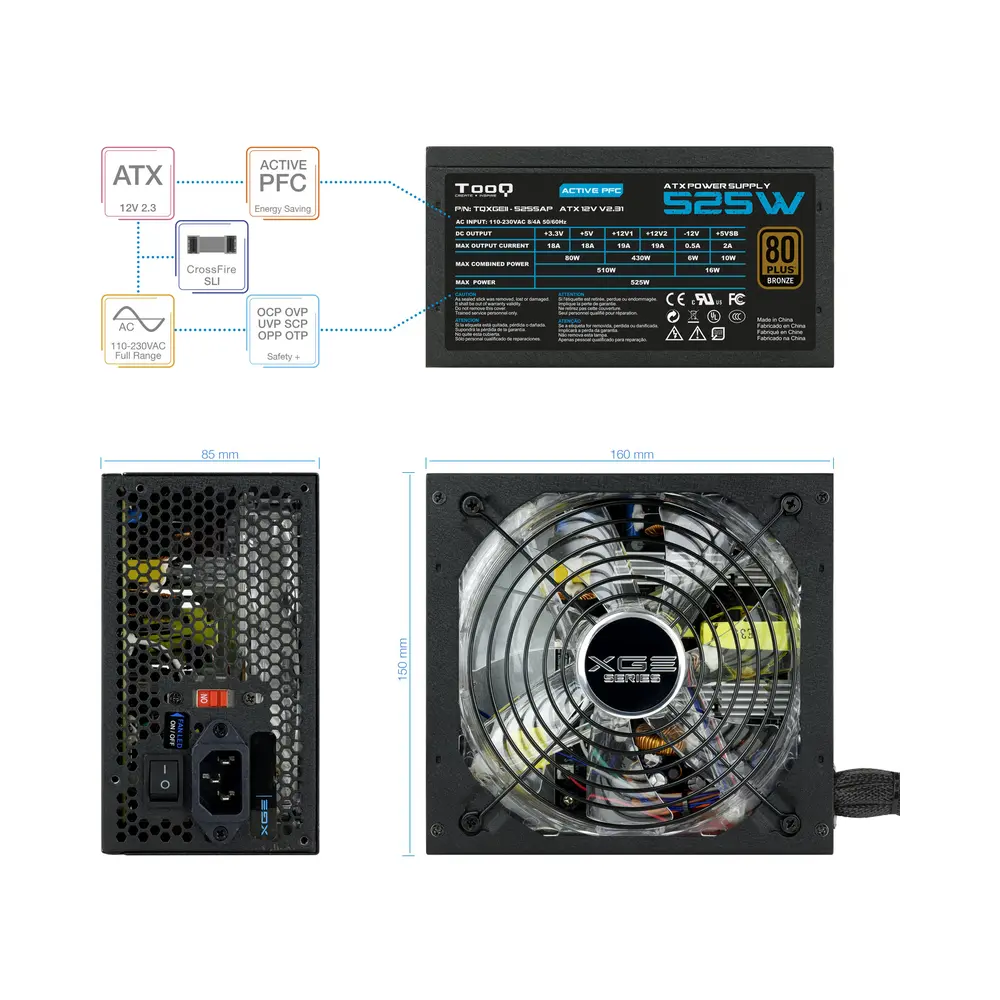 A serie gaming XGE II da TOOQ está dirigida para os jogadores entusiastas e exigentes com as suas configurações. Esta fontes de alimentação tem o certificado 80 PLUS BRONZE, o que garante mais de 82% de eficiência. A potente saída +12V garante a alimentação de microprocessadores e GPU multi-núcleo de última geração. A fonte vem com uma ventoinha com luz LED azul. Há jogadores que preferem caixas mais altas, por isso esta fonte de alimentação inclui cabos extra-longos e protegidos de malha para que possam montar o seu PC sem problemas e sem surpresas. No geral, é o “coração” perfeito e poderoso para dar um impulso ao seu PC.
