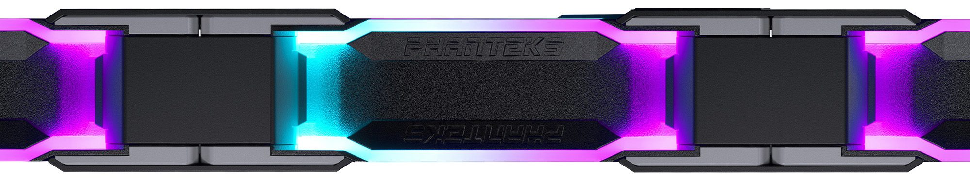 A iluminação D-RGB é integrada e visível de todos os lados do ventilador D30-120. As lâminas refletem a luz proveniente do anel de iluminação Halos no interior da estrutura. Isto torna o efeito de iluminação mais brilhante e mais suave do que o habitual. As linhas difusoras na armação passam o efeito de iluminação de uma ventoinha para a outra criando um efeito de corrente em todo o sistema.