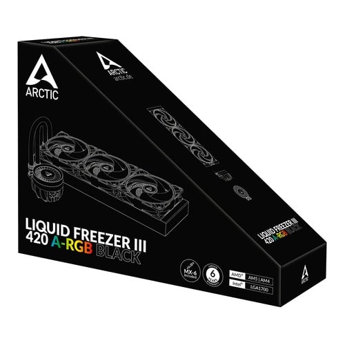 O Liquid Freezer III está pronto a ser utilizado imediatamente graças às ventoinhas de radiador pré-instaladas na configuração push. Os cabos das ventoinhas estão integrados no revestimento das mangueiras, pelo que só é necessário ligar um cabo à motherboard. Com o composto térmico MX-6 incluído na entrega, tem tudo o que precisa para uma instalação rápida e fácil.