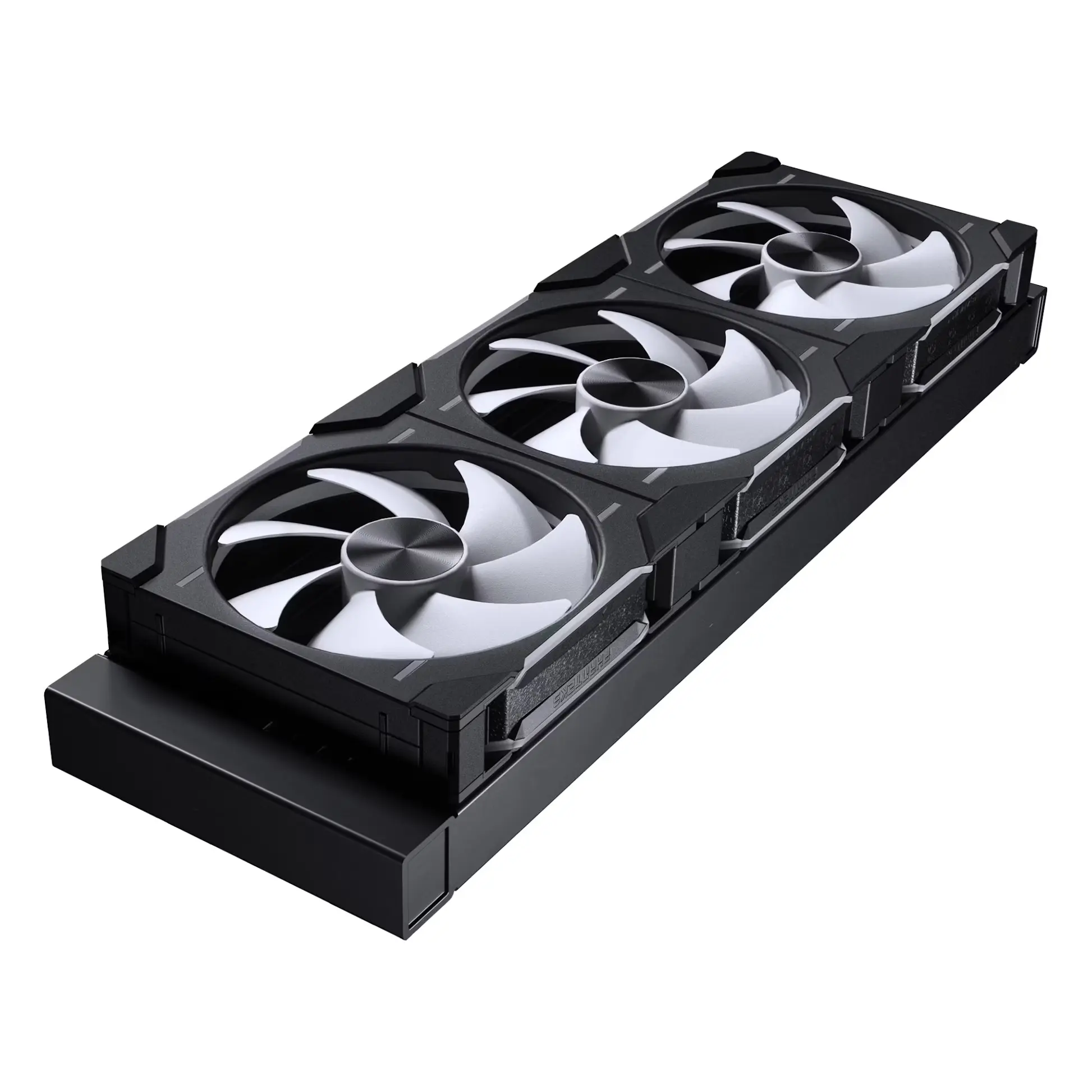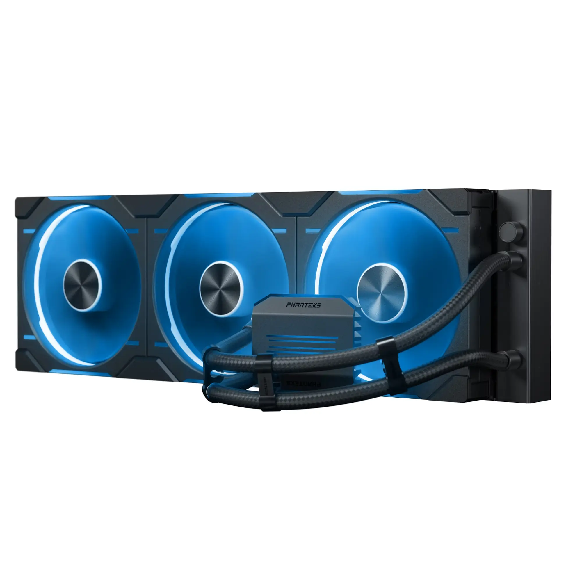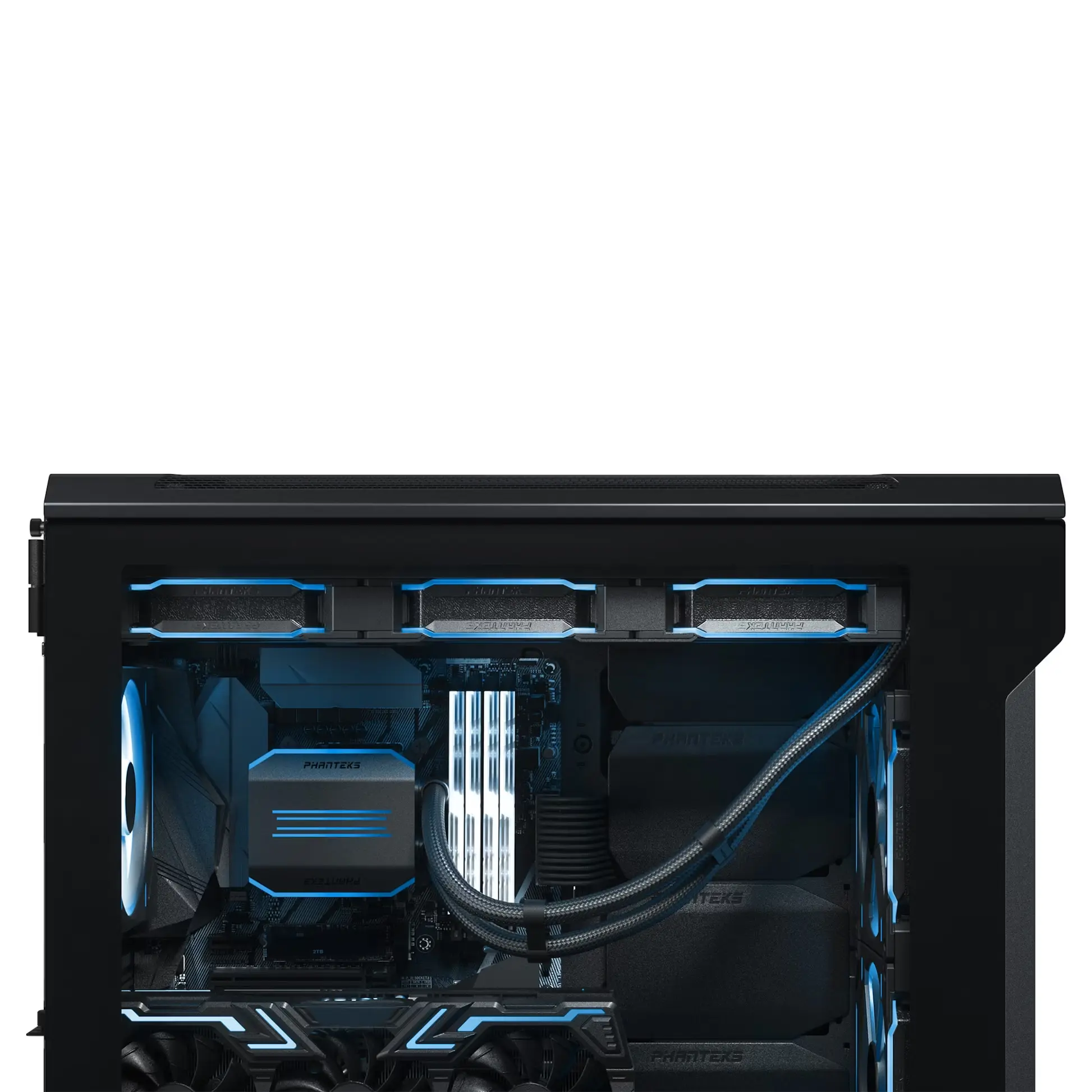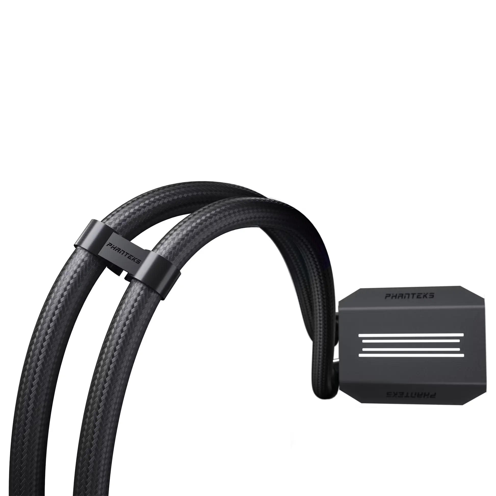 A tampa da bomba de baixo perfil foi concebida com um encaixe giratório que se mantém junto à bomba para permitir o máximo de espaço livre para os componentes da motherboard e a RAM. Inclui três ventoinhas PWM D30 DRGB de 140 mm com iluminação D/A-RGB, lâminas aerodinâmicas de 30 mm de espessura inspiradas na icónica ventoinha T30. Também inclui um sistema de ligação de ventoinhas fácil e minimalista que utiliza clips para ligar as ventoinhas e reduzir a confusão de cabos. A iluminação D/A-RGB pode ser controlada e sincronizada com produtos de iluminação D-RGB da Phanteks e com caixas e motherboards equipadas com D/A-RGB.